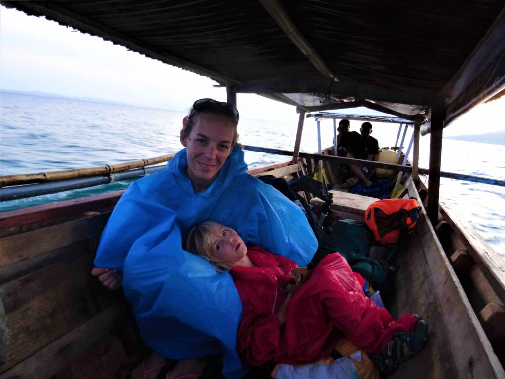 A Wakai, notre bateau est déjà là. J’abandonne Chaton et Chatounette au pied de celui-ci pour aller faire quelques courses, m’étant au préalable renseignée si j’avais le temps ou pas d’y aller. Chaton voulait de la bière Bintang, et je galère avant d’en trouver. Plusieurs magasins en vendaient, mais sans alcool. Pas sûre que cela lui aurait convenu ! Je finis par les trouver, et me rends dans une autre boutique pour acheter le reste. Au moment où je m’apprêtais à rentrer à l’intérieur, un homme m’interpelle pour me signaler que le bateau va partir. Il me permet tout de même de rentrer mais de faire très vite. Effectivement, j’entends la trompe du bateau retentir. Je ferai le trajet jusqu’au bateau en courant, chargée de 2 bières de 75cL, 3 bouteilles de 1,5L et 4 énormes boites de gâteaux, le tout sous une chaleur torride. Le bateau largue les amarres au moment où je monte dedans.