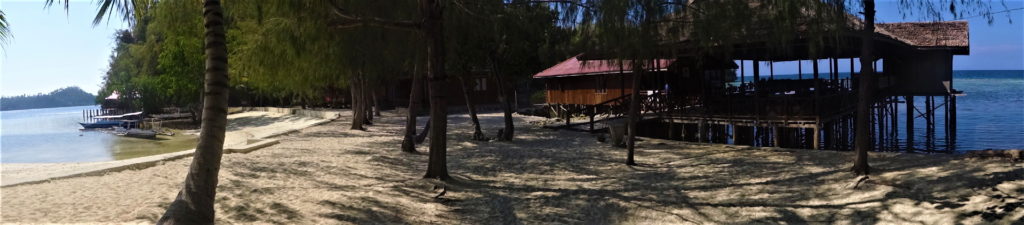 Mais avant cela, petite exploration des environs à pied. L’île a une forme de 8 : un petit rond, un passage très étroit où sont installés la terrasse du restaurant et quelques cottages dont le nôtre, et un grand rond.