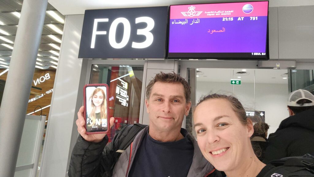 Notre premier vol s’effectue d’Orly à 21h50, et nous apprenons au comptoir d’enregistrement que nous ne récupèrerons pas notre gros sac à dos à Casablanca. On en est ravis mais nous devons revoir l’agencement de nos sacs ! Les palmes, masques et tubas qui étaient dans nos petits sacs à dos sont troqués contre la brosse à dent, une tenue de rechange et une serviette. Une belle exposition d’affaires au pied du comptoir d’enregistrement !