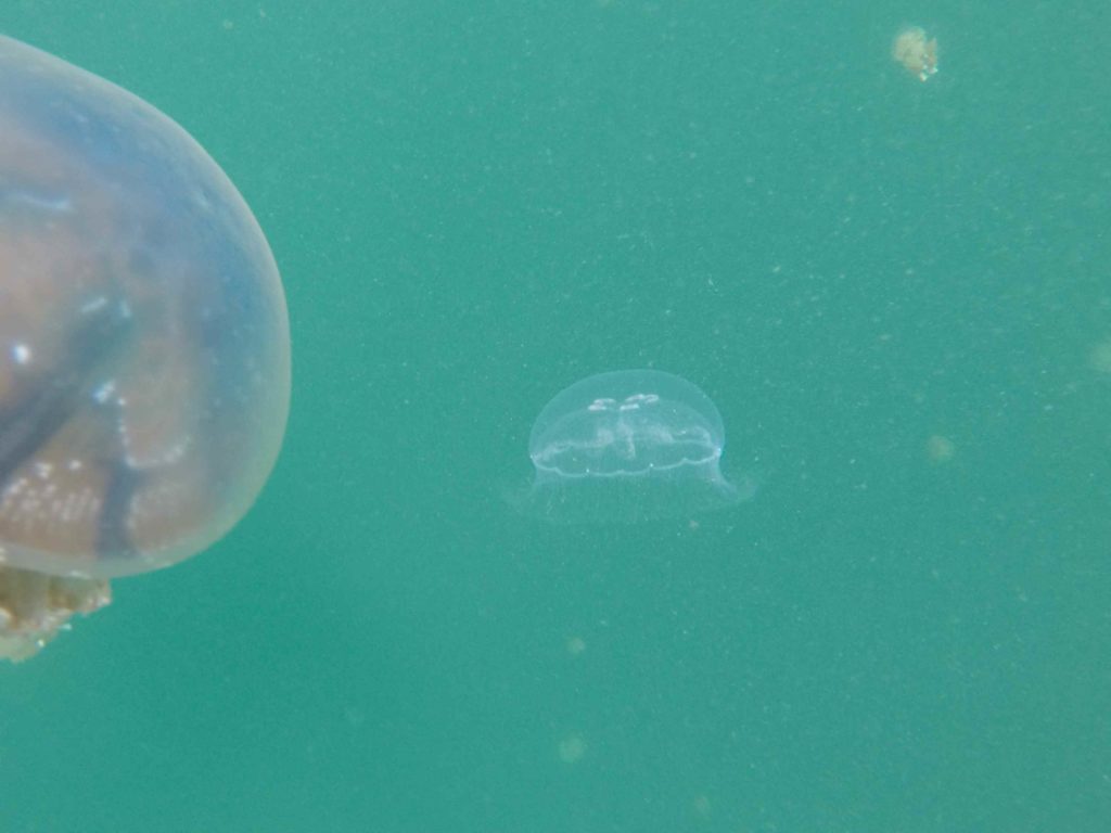 Nous attendons qu’une Allemande les touche pour nous jeter à l’eau. C’est impressionnant ! Il y a des méduses par centaines, de la plus petite à la plus grosse. Le décor est troublant, l’eau est d’un vert plutôt sombre, la visibilité est moyenne (je dirais 10 mètres) et les rayons du soleil font ressortir les milliards de particules en suspension. On a l’impression d’être dans l’espace, tels des cosmonautes !