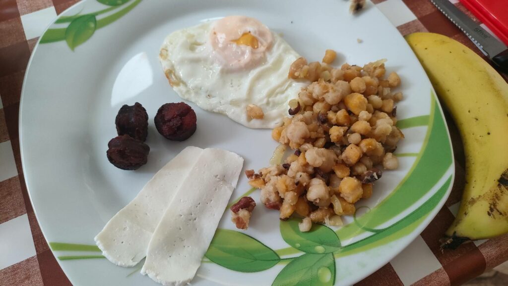 Nous avons démarré la journée par un petit-déjeuner bien copieux et local. Sur la photo, ça ne fait pas très copieux, c’était un échantillon…